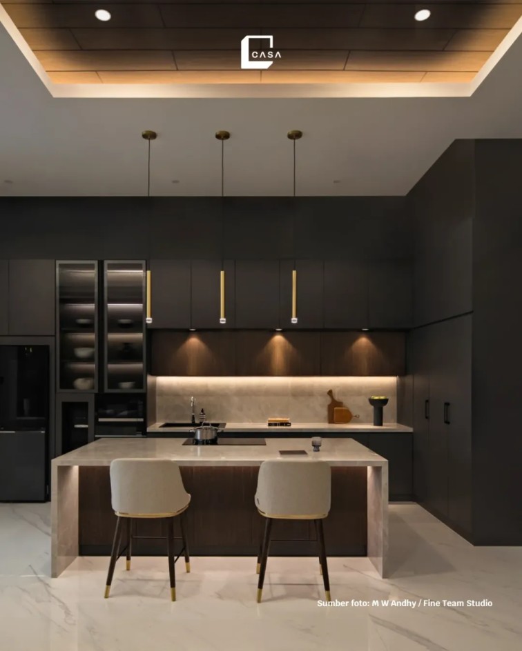 Selain mampu meningkatkan daya tarik visual area dapur, lemari dapur minimalis bernuansa monokrom ini juga tetap mengutamakan fungsionalitasnya dengan ruang penyimpanan yang banyak, sehingga memungkinkan Anda untuk menyimpan peralatan dapur dan perlengkapan makan dengan rapi, tertata, dan tetap terjaga kebersihannya. Pencahayaan lembut di sekitar area backsplash menambah suasana hangat, sekaligus membuat dapur terasa semakin nyaman, modern, dan tampak mewah.