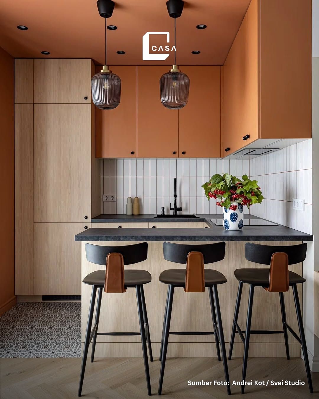 Lemari gantung warna kayu natural yang dipadukan dengan backsplash tile berwarna putih membuat tampilan dapur terasa semakin hangat, nyaman, dan modern.