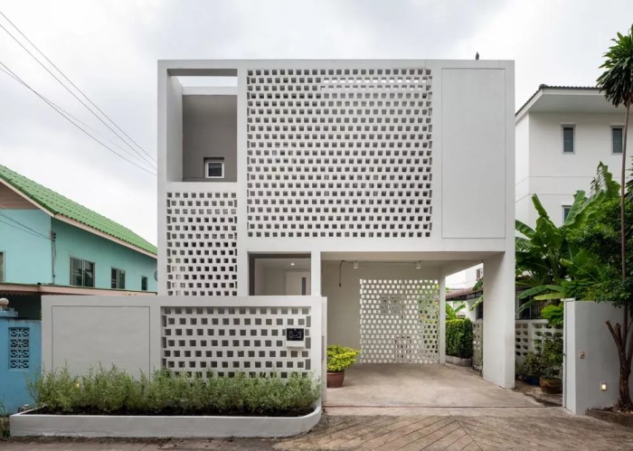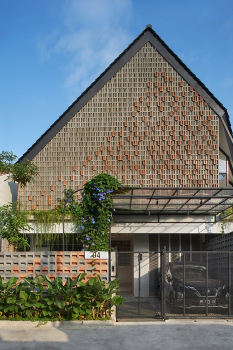 Model pagar roster terbaru berbahan bata terakota pada hunian ini menghadirkan perpaduan unik antara kesan tropis, alami, dan modern. Warna hangat dari roster bata terakota menciptakan kontras yang menarik saat dipadukan dengan material beton ekspos sebagai bagian dari struktur rumah.