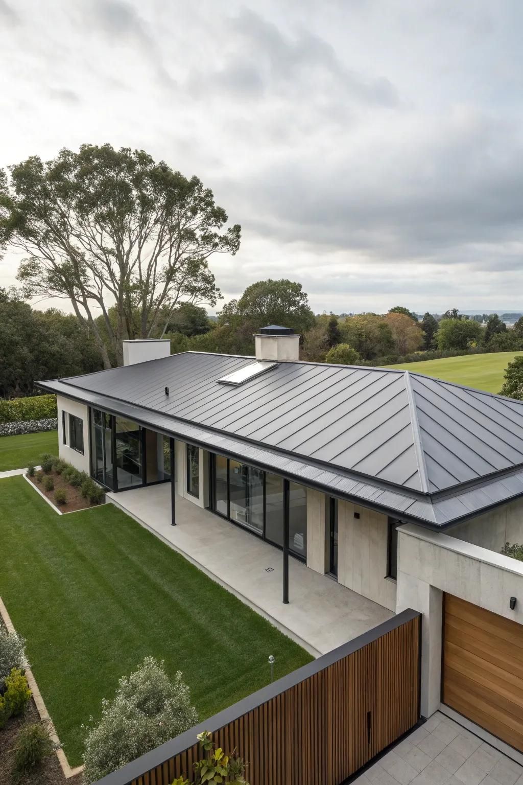 Warna netral seperti abu-abu, hitam, atau cokelat tua banyak dipilih untuk mempertegas garis atap. Selain itu, material yang ringan dan tahan cuaca membantu menjaga struktur tetap efisien serta memudahkan perawatan jangka panjang.