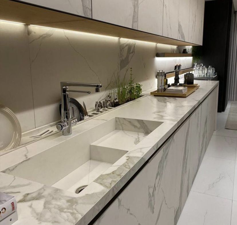 Model tanam menjadi pilihan utama pada dapur modern karena tampilannya yang rapi dan menyatu dengan countertop. Keramik diaplikasikan langsung ke dalam meja dapur, sehingga tidak menyisakan banyak sambungan visual yang mengganggu.