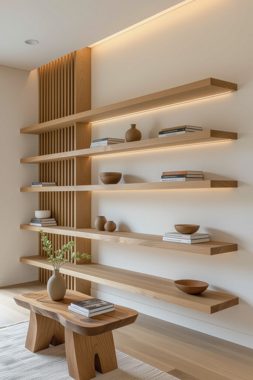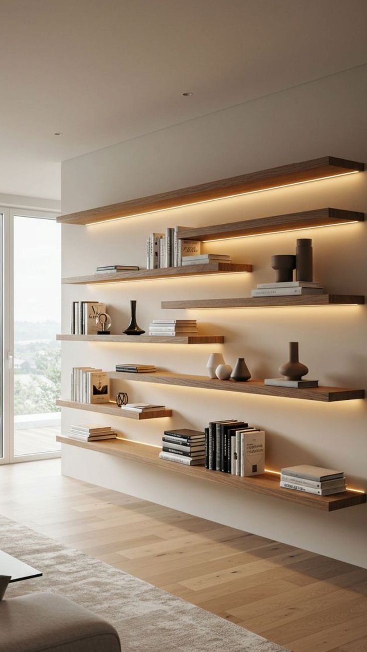 Rak dinding dekoratif juga semakin populer karena menggabungkan fungsi dan estetika. Selain sebagai hiasan, rak ini dapat menampilkan koleksi buku, vas kecil, atau dekor personal yang memberi karakter unik pada ruang tamu.