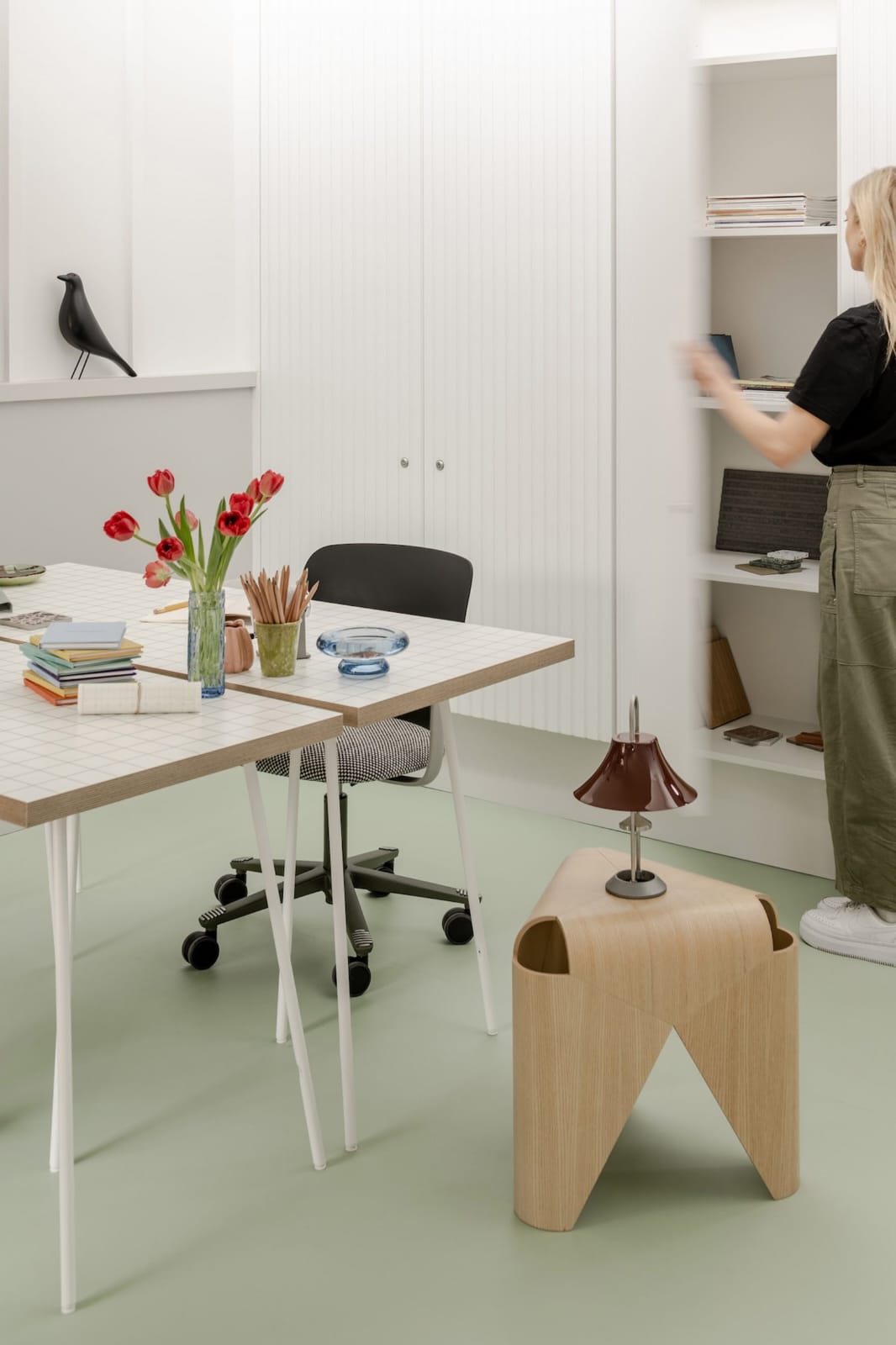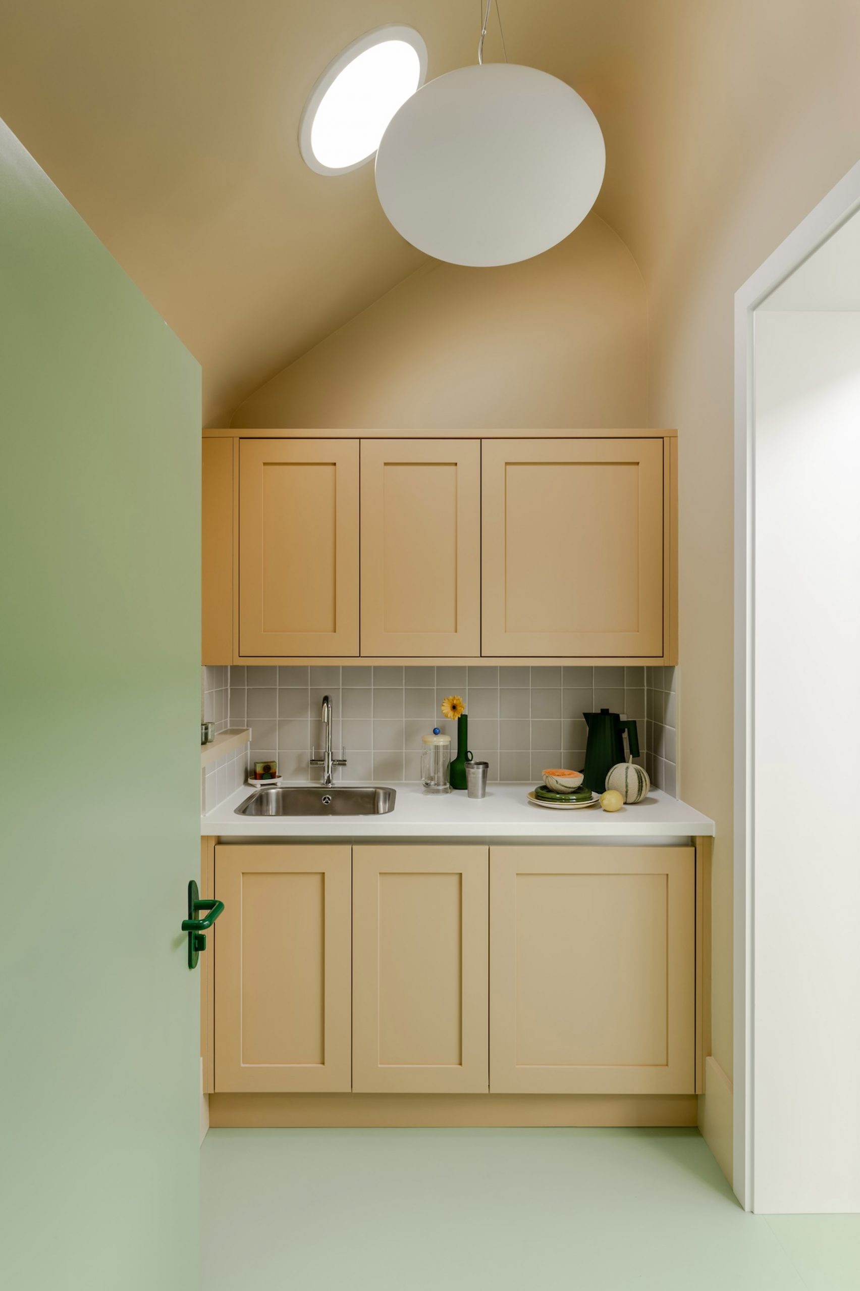 Interiornya sederhana namun penuh pertimbangan: lantai vinyl berwarna zonal membedakan fungsi area, dari ruang tunggu hingga meja kerja staf, kitchenette, hingga toilet yang dirancang inklusif.