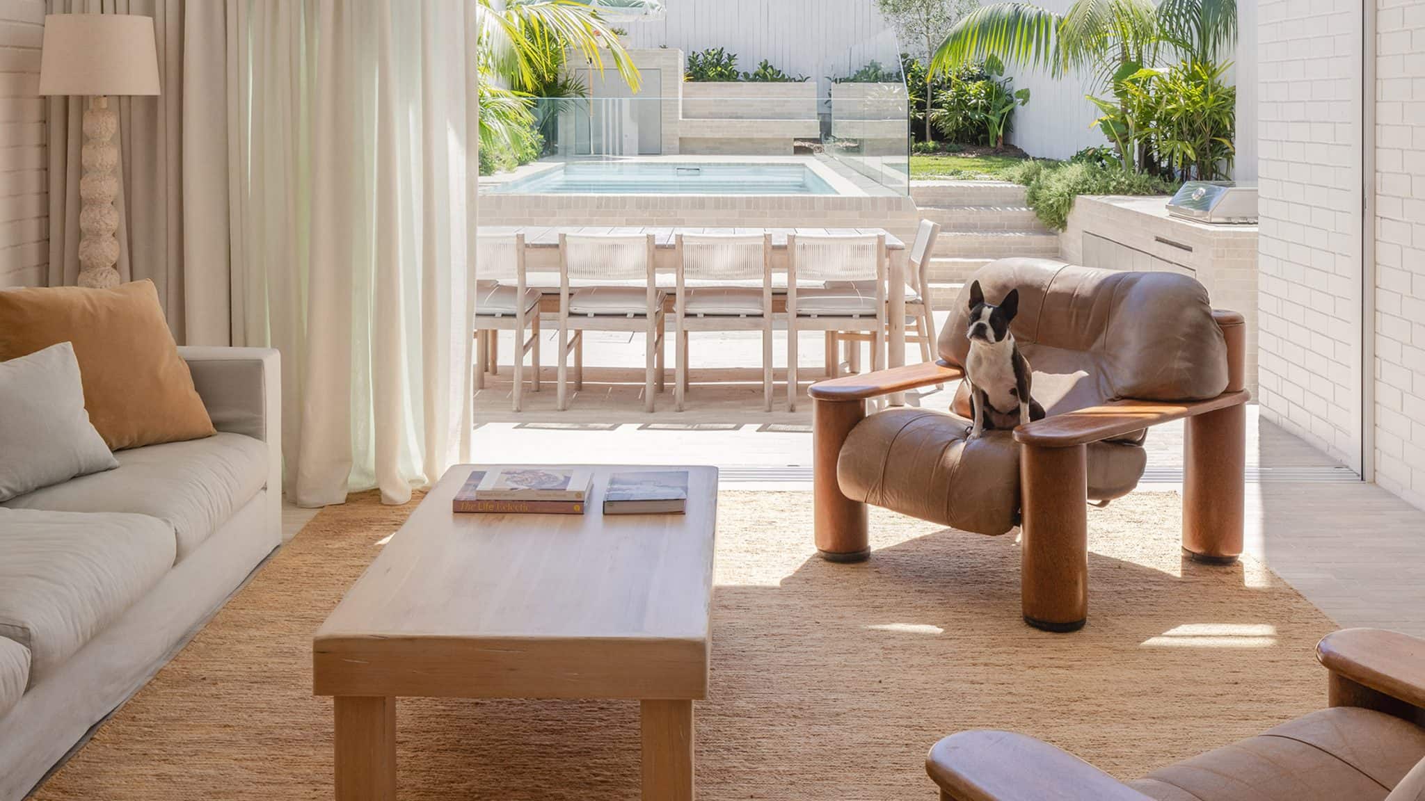 Ruang keluarga memiliki pintu kaca geser besar yang terbuka langsung ke taman belakang dan area kolam renang. Menariknya, material lantai batu kapur berwarna terang digunakan secara konsisten dari interior hingga eksterior, menciptakan transisi ruang yang halus dan menyatu.