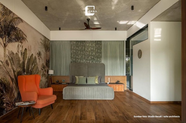 Dipadukan dengan motif wallpaper yang bernuansa alam dan posisi kamar tidur yang terhubung langsung ke area teras belakang rumah, semakin menegaskan nuansa tropis modern yang nyaman dan menyatu dengan alam pada kamar tidur. Untuk menjaga privasi ke dalam kamar tidur, Anda bisa menggunakan blackout curtain yang menutupi keseluruhan pintu kaca.