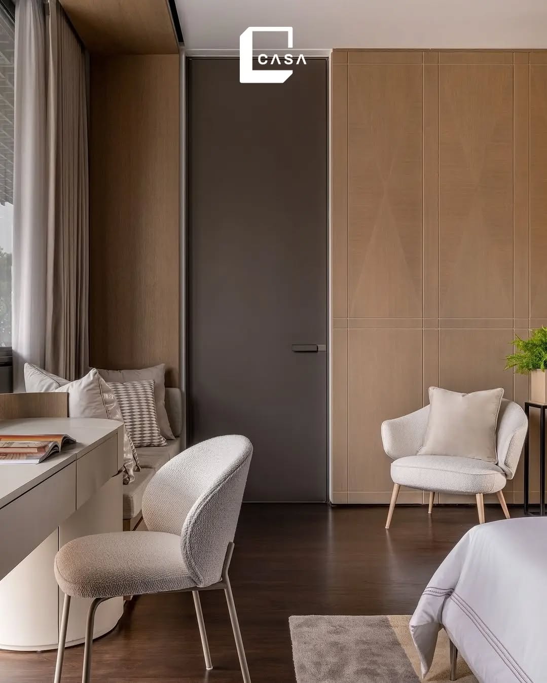 Kamar tidur ini menggunakan model pintu seamless yang dilengkapi dengan knob minimalis. Desainnya yang halus tanpa kusen menciptakan kesan rapi dan tampak menyatu dengan dinding. Knob minimalis berfungsi sebagai aksen fungsional tanpa mengganggu kesan tampilan seamless pada pintu.