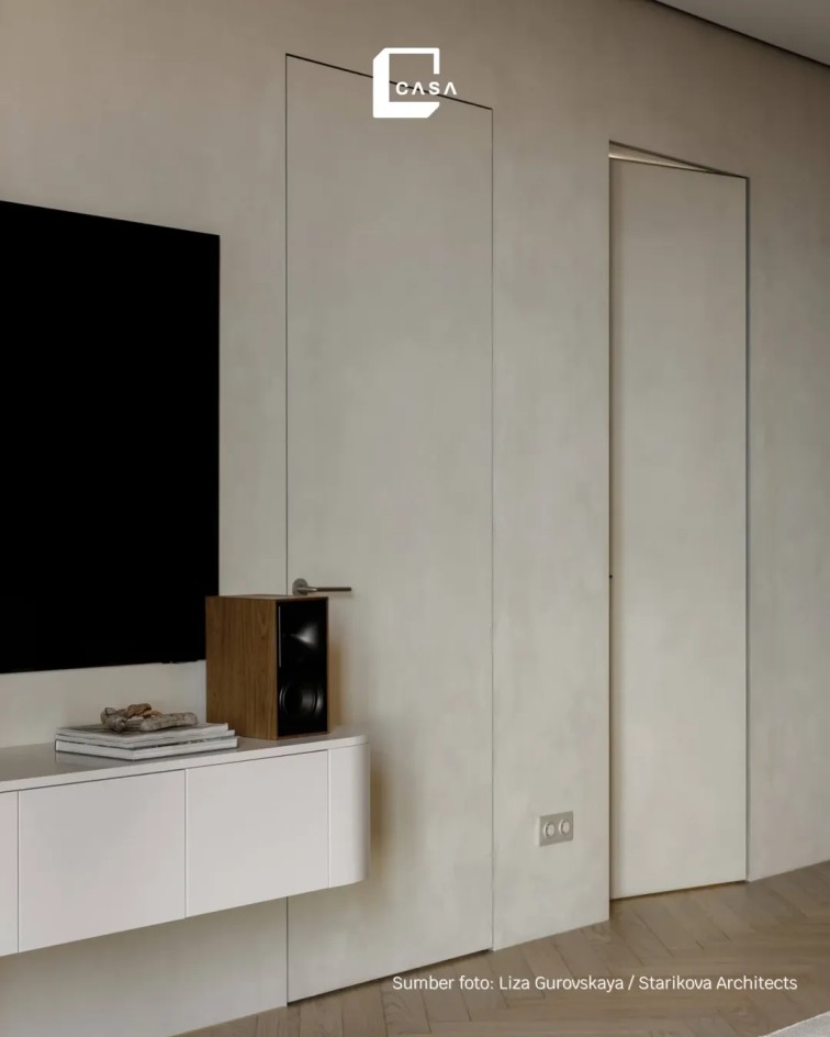 Desain pintu seperti ini menciptakan kesan modern, rapi, dan eksklusif, menjadikannya ideal untuk hunian yang mengutamakan tampilan seamless tanpa mengesampingkan aspek fungsionalnya untuk penggunaan sehari-hari.