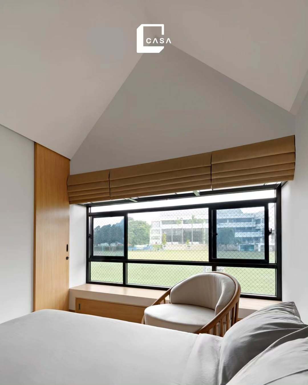 Kamar tidur ini menggunakan model pintu dengan kombinasi material kaca dan kayu dengan sistem geser atau sliding door, yang tak hanya fungsional tetapi juga hemat ruang karena tidak membutuhkan area bukaan yang luas. Bingkai kayu memberikan kesan hangat dan natural, sedangkan panel kaca memungkinkan cahaya alami masuk ke dalam kamar secara optimal, membuat kamar terasa lebih terang dan lapang.