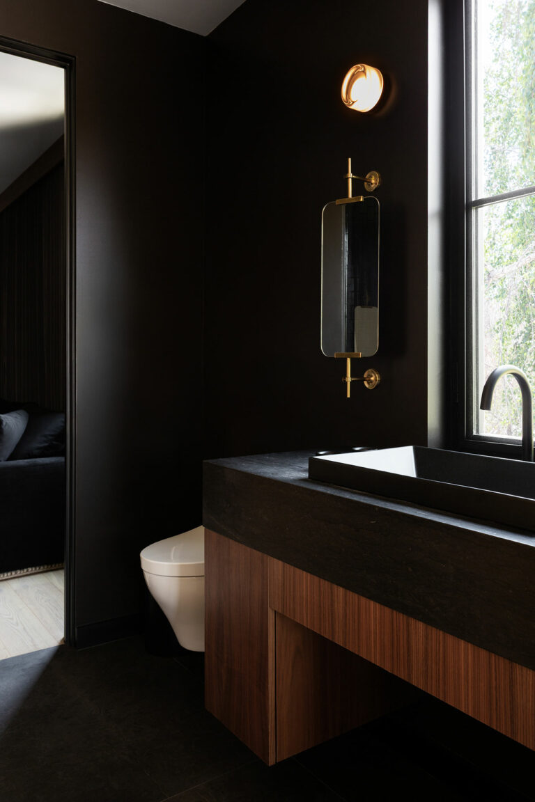 Di kamar mandi, tekstur plaster dan pencahayaan alami menciptakan suasana tenang tanpa kesan berlebihan. Ruang ini dirancang sebagai tempat beristirahat yang bebas dari gangguan visual dan memberi rasa nyaman secara menyeluruh.