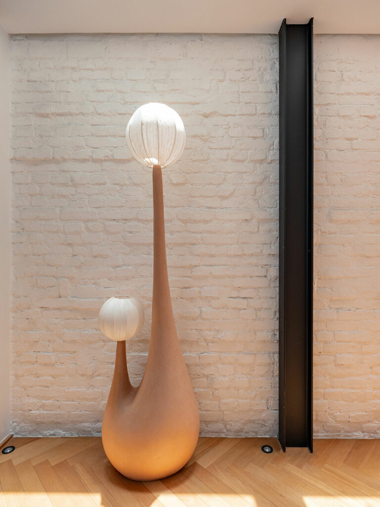 Dinding bata yang semula tersembunyi di balik plaster kini diungkap kembali dan dicat putih. Ini bukan hanya memberi catatan sejarah terhadap bangunan lama dan batasnya, tetapi juga membantu memantulkan cahaya alami ke seluruh ruang, menjadikan interior terasa lebih terang sekaligus lebih luas.