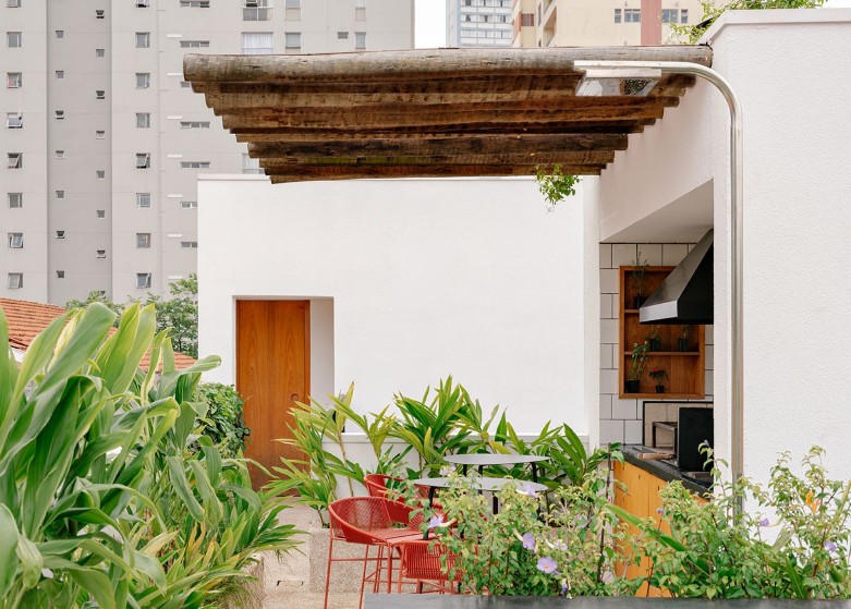 Inti dari rencana rumah adalah sebuah taman kecil dengan pohon araçá asli Brasil yang menjadi pusat kehidupan ruang. Taman ini tidak hanya menghadirkan keteduhan tetapi juga memungkinkan cahaya alami masuk lebih dalam ke dalam rumah dan membantu ventilasi silang melalui seluruh bangunan. Solusi ini penting karena lebar lahan yang sangat terbatas. Kamar-kamar tidur dirancang menghadap ke taman ini sehingga menciptakan suasana privat yang damai meskipun lingkungan sekitarnya padat dan aktif.