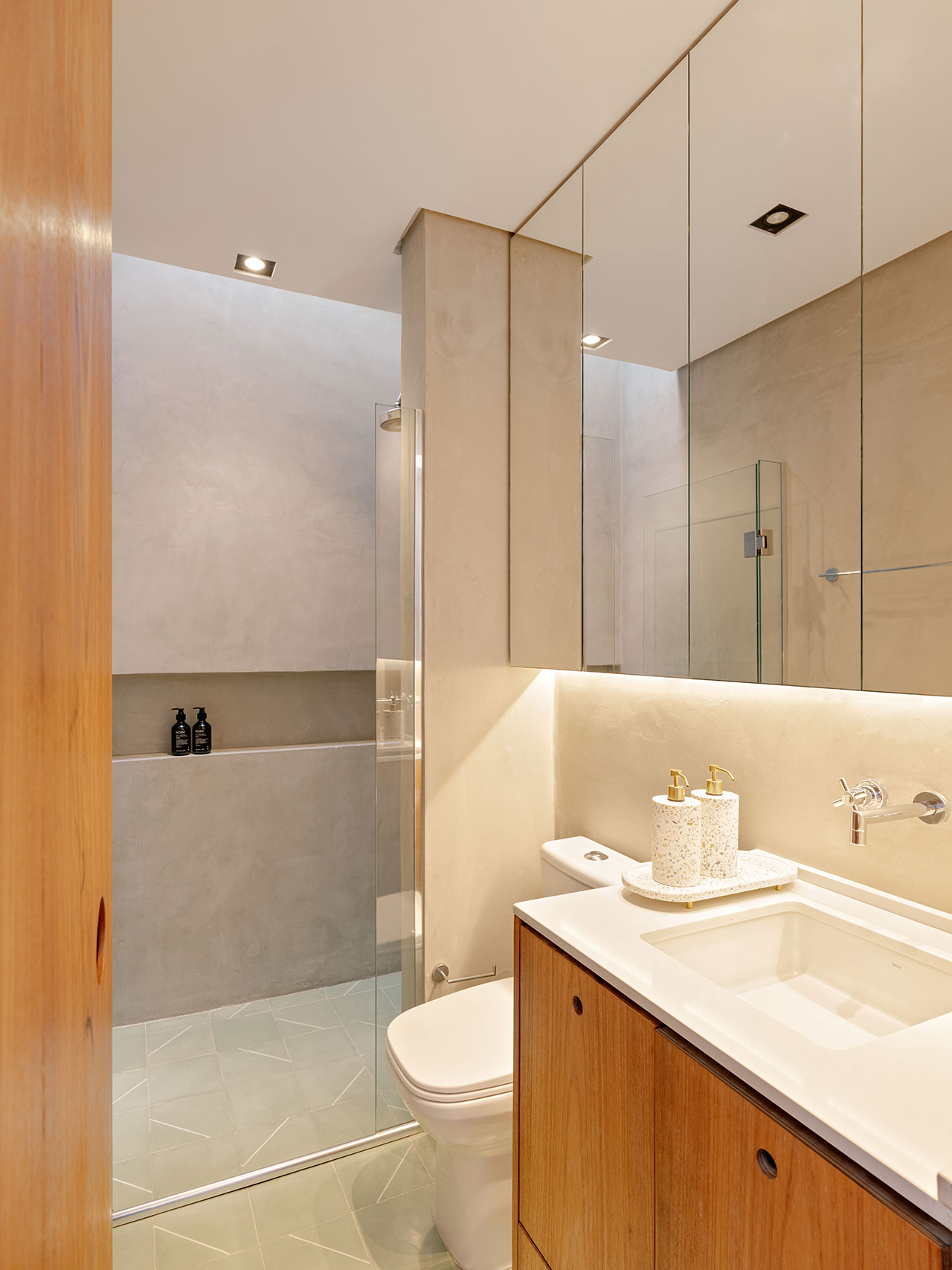Kamar mandi di lantai atas membawa nuansa berbeda yang lebih tenang dan intim. Perpaduan permukaan semen halus dengan ubin hydraulic tiles berwarna lembut memberi kualitas estetika yang terasa seperti ruang spa kecil. Bukaan skylight di area ini juga menyediakan ventilasi alami, memastikan bahwa di setiap sudut rumah ada hubungan dengan udara luar yang segar dan pencahayaan alami yang seimbang.