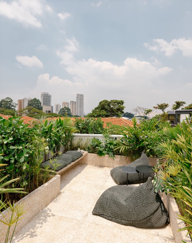 Bagian paling tak terduga dari rumah ini adalah ruang rooftop. Dicapai melalui pembuka kaca dan logam yang dimotorisasi, rooftop menjadi area luar ruang yang digunakan sebagai dapur luar dan lounge. Ruang ini dibungkus oleh deretan tanaman sehingga meskipun dikelilingi oleh bangunan tinggi di sekitarnya, area ini terasa seperti taman pribadi yang terlindung sekaligus terbuka.