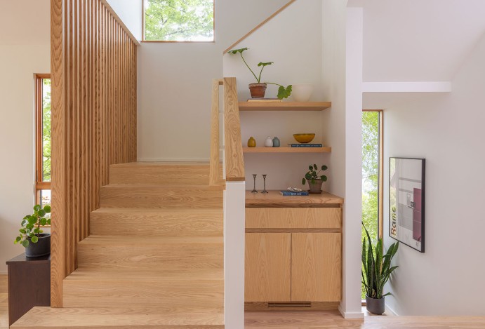 Bagian dalam rumah ini menunjukkan kesederhanaan yang elegan. Elemen seperti built-in ash custom dibuat di banyak area sehingga memberi penyimpanan yang fungsional sekaligus visual hangat. Kayu ash ini membantu menciptakan ritme ruang yang lebih tenang dibandingkan dengan geometri postmodern yang tadinya terfragmentasi.