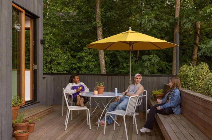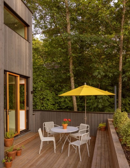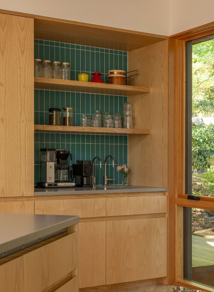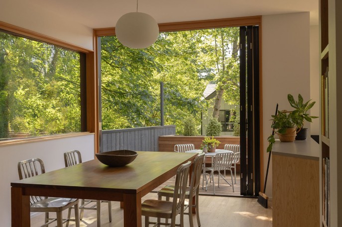 Salah satu fokus utama renovasi ini adalah menciptakan hubungan visual dan fisik yang kuat antara interior dan lingkungan luar. Untuk mencapai itu, rumah ini kini memiliki pintu geser dan lipat berukuran besar di fasad barat yang dapat dibuka lebar saat cuaca memungkinkan. Dengan cara ini, area ruang keluarga dan dek luar menjadi satu ruang kontinu yang menghadirkan hutan kota langsung ke dalam pengalaman hidup sehari-hari.