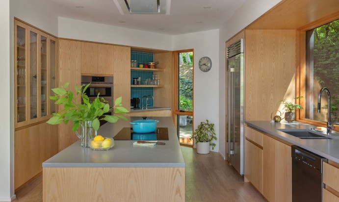 Sebelumnya, denah rumah ini memiliki ruang kecil yang kurang berfungsi dekat pintu masuk. Untuk membuat rumah terasa lebih relevan untuk kehidupan modern, dapur dipindahkan dan diperluas sehingga menjadi pusat kehidupan sosial rumah. Ruang ini kini memiliki pulau dapur besar yang menjadi tempat berkumpul, sekaligus penghubung visual dan sirkulasi yang lebih baik ke ruang tamu dan ruang makan.