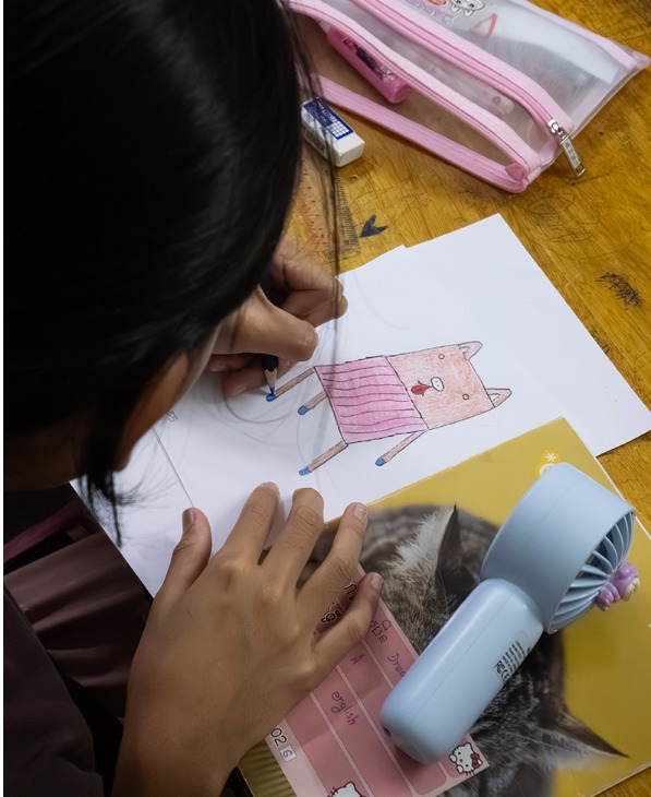 Proses dimulai dengan kegiatan menggambar. Anak-anak diminta menggambar kursi atau bangku sesuai imajinasi mereka, tanpa batasan bentuk atau warna. Coretan ini menjadi eksplorasi awal mengenai fungsi, struktur, dan ekspresi visual. Dari gambar tersebut, anak-anak kemudian diajak memahami tubuh mereka sendiri. Mereka bekerja berpasangan untuk mengukur tinggi badan dan dimensi tubuh, lalu mendeskripsikan kursi seperti apa yang ingin mereka buat berdasarkan ukuran tersebut.