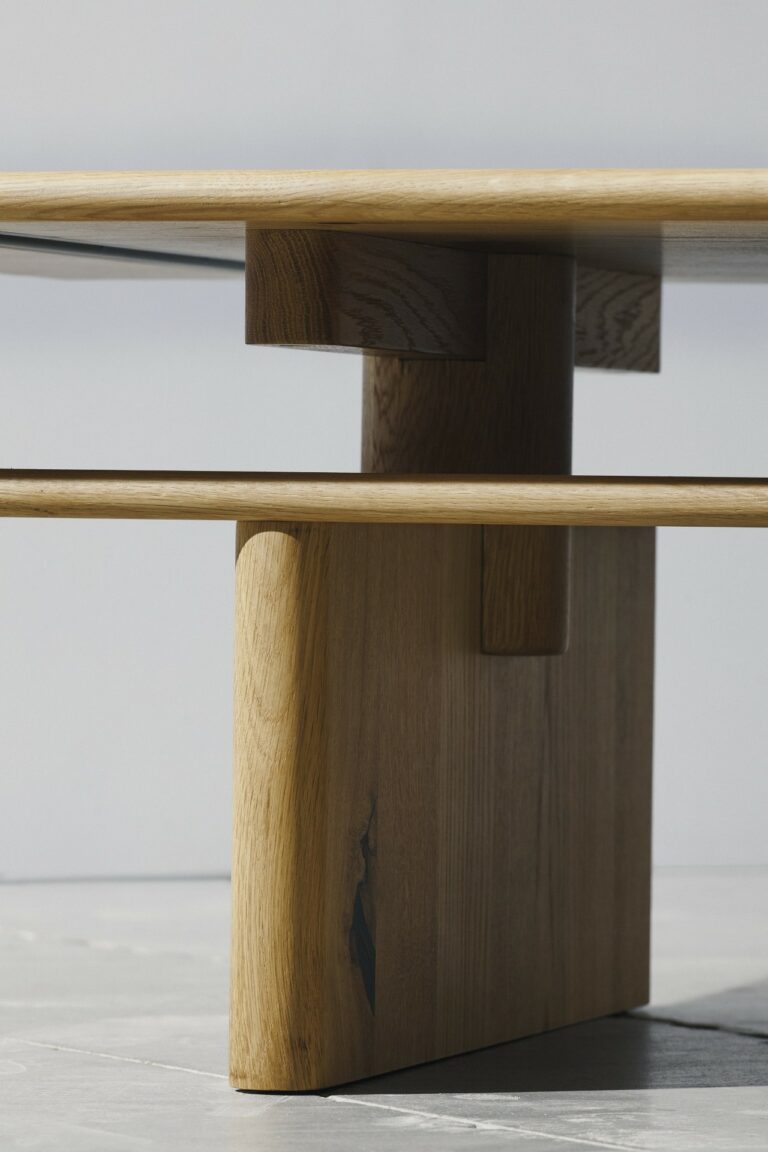 Kayu solid seperti oak atau walnut digunakan untuk menekankan kualitas material yang tak lekang oleh tren. Permukaan meja yang halus dipadukan dengan sudut yang sedikit dibulatkan membuat meja ini bukan sekadar furnitur fungsional tetapi juga karya seni yang mengundang orang berkumpul, makan bersama, dan berbagi momen setiap hari.