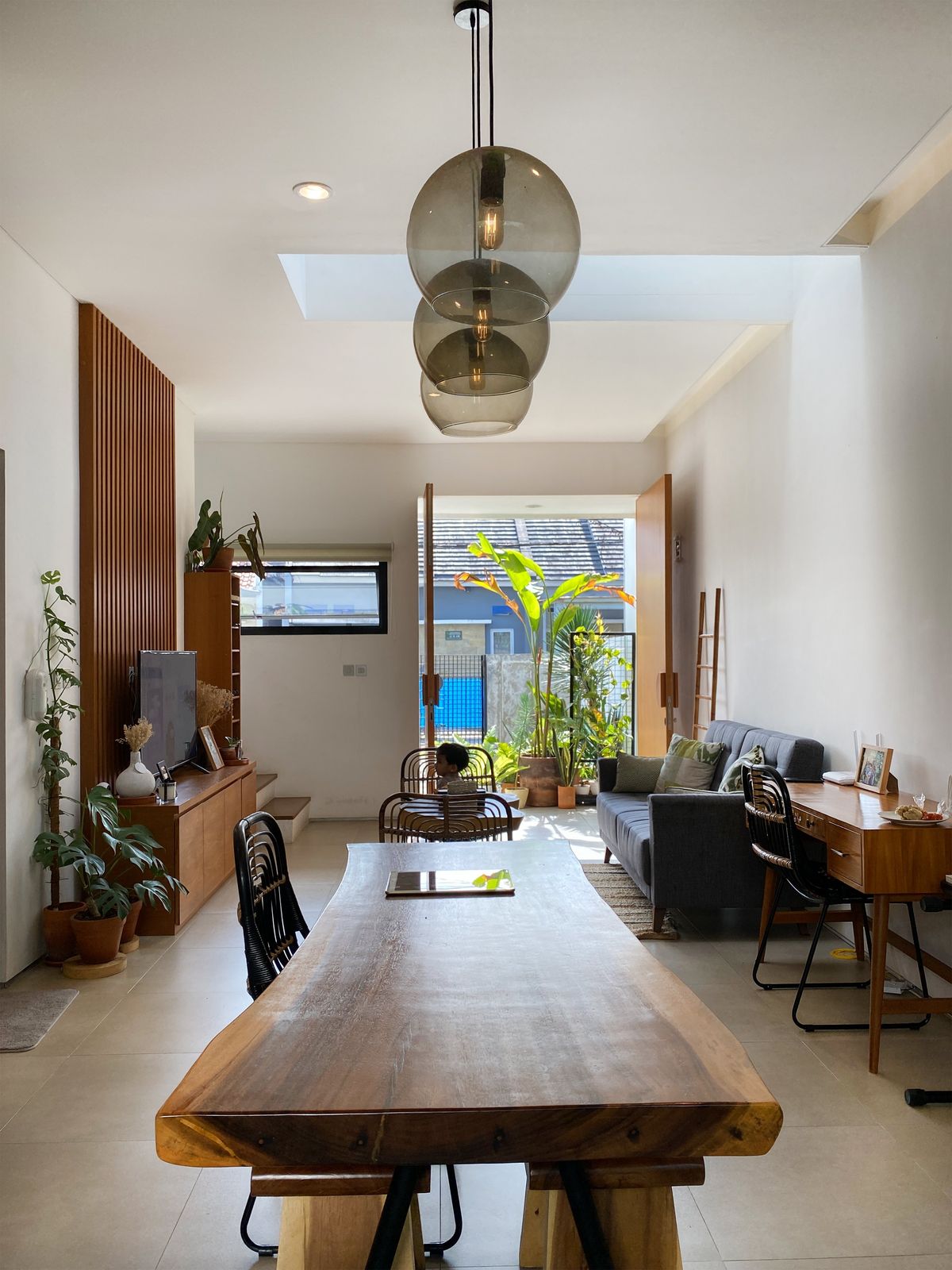 Penggunaan pintu kaca geser juga dapat membantu menghubungkan ruang dalam dan luar secara visual. Selain itu, hindari sekat permanen yang berlebihan karena dapat membuat rumah terasa sempit. Penataan furnitur secara vertikal seperti rak dinding membantu menjaga area lantai tetap lega.