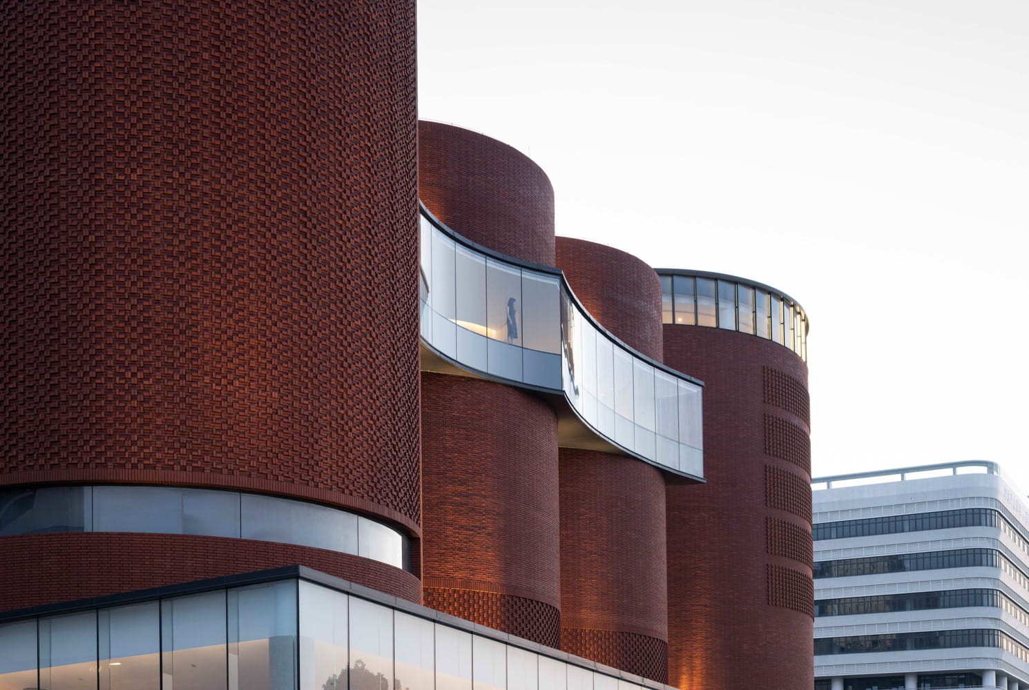 Fasad bangunan tidak dibuat masif. Bata disusun dengan berbagai pola berlubang dan berlapis, sehingga cahaya dan udara tetap bisa masuk. Pendekatan ini membuat bangunan terasa lebih ringan dan tidak tertutup, sekaligus menciptakan bayangan yang berubah sepanjang hari.