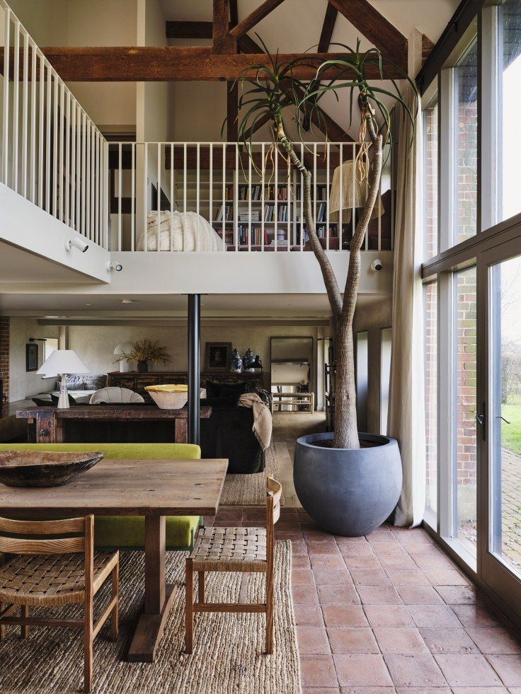 Jika pada poin sebelumnya lebih menekankan pada nuansa minimalis, ide yang satu ini memberikan Anda perspektif baru melalui tekstur ekspos serta estetika yang lebih maskulin. Dengan menghadirkan elemen-elemen tersebut, desain semi industrial bisa menjadi pilihan Anda dalam model rumah 1 ½ lantai. Kombinasi beton ekspos, rangka besi pada tangga, railing logam, dan lampu gantung industri dapat memberikan nuansa urban yang kuat. Lantai setengah lantai biasanya bisa dibuat sebagai ruang kerja terbuka atau area baca yang menghadap ruang utama. Dengan desain ini, bagian atas rumah tidak terasa seperti sebuah ekspansi yang kaku, melainkan sebuah kesatuan estetika yang terkonsep.
