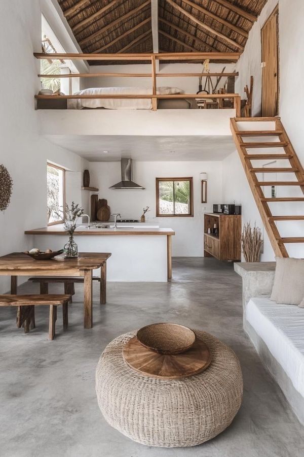 Anda mendambakan suasana hangat sekaligus ketenangan pada rumah Anda? Suasana ini bisa Anda capai melalui kehangatan tone warna yang menyelimuti rumah Anda. Desain rumah 1 ½ lantai dengan warna-warna earth tone ditambah dengan elemen material alami seperti kayu dan batu dapat menciptakan suasana yang hangat dan inviting. Tangga dan lantai mezzanine bisa menggunakan kayu gelap atau finishing yang menonjolkan serat kayu. Kombinasinya dengan warna dinding yang lembut membuat transisi antar ruang terasa begitu seamless dan harmonis. Jika anda memasukkan aksen tanaman indoor atau material kasar seperti batu alam, efek estetis dan kenyamanan visual rumah akan meningkat.