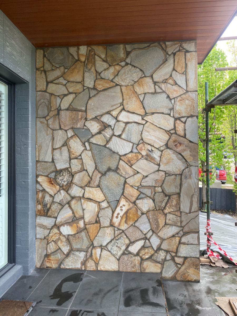Menggabungkan batu dengan warna yang berbeda untuk menciptakan kontras visual yang menarik. Model ini bisa menonjolkan karakter kuat dan memperkaya nuansa pada fasad rumah modern.