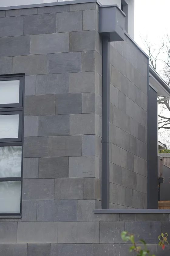 Batu dipasang secara vertikal memanjang dari bawah ke atas, sering kali dengan batu berukuran besar atau panjang. Model ini memberikan aksen tinggi dan dramatis pada dinding, memperkuat garis vertikal pada fasad rumah modern.