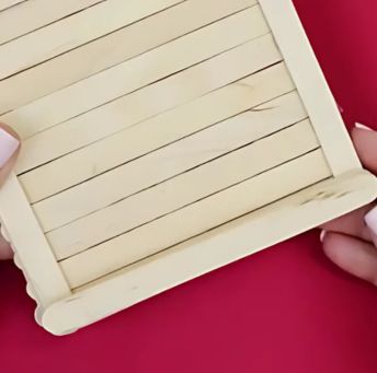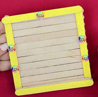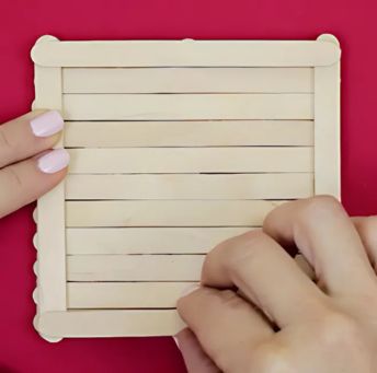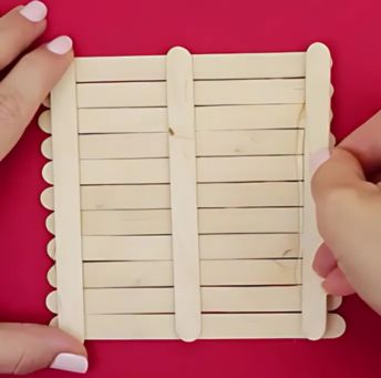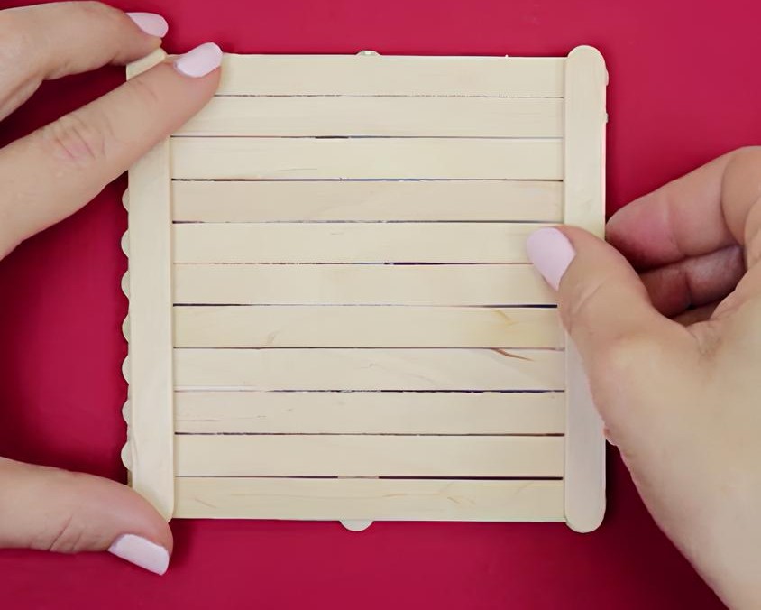 Setelah itu, masih di sisi yang sama, rekatkan lagi satu stik es krim di bagian atas dan satu stik es krim di bagian bawah dengan posisi horizontal di atas kedua stik vertikal tadi.