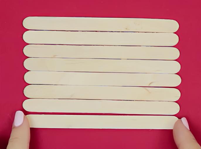 Susun delapan stik es krim secara berdampingan dengan posisi horizontal. Pastikan posisinya sejajar agar hasilnya rapi. Ini akan menjadi dasar bingkai foto Anda.