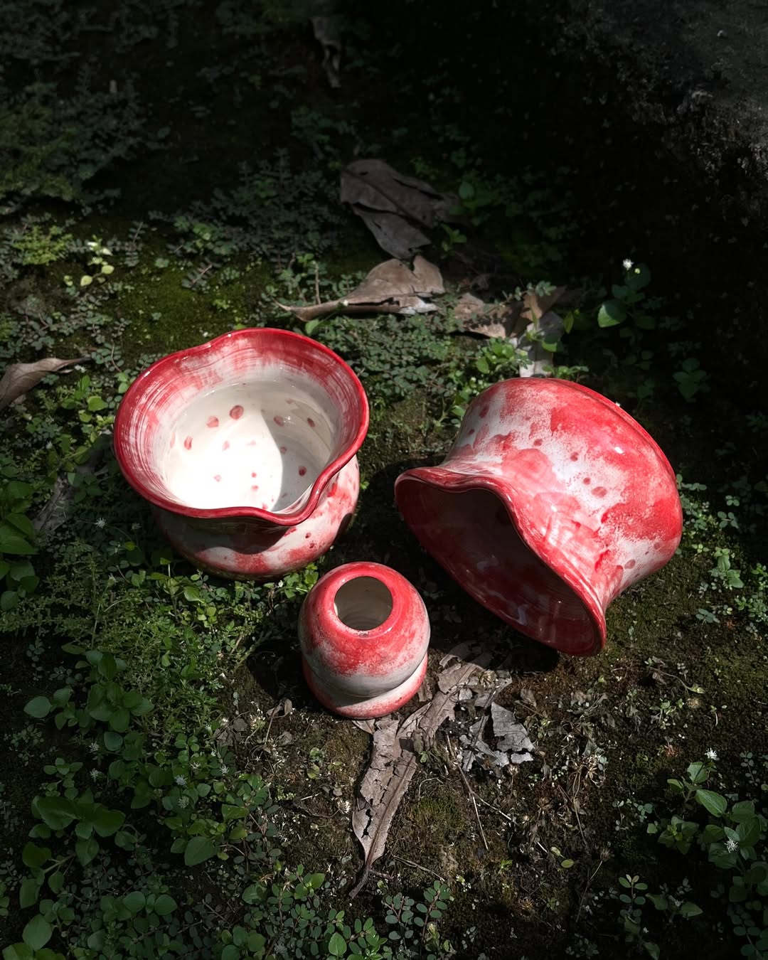 Seri Red Chawan & Chasen karya Karyaku Kata menghadirkan motif bunga abstrak yang dilukis tangan, terinspirasi dari “Taman Bunga” di hutan impian. Set ini menggabungkan nilai seni, fungsi, dan nuansa alami dalam setiap detail keramiknya.