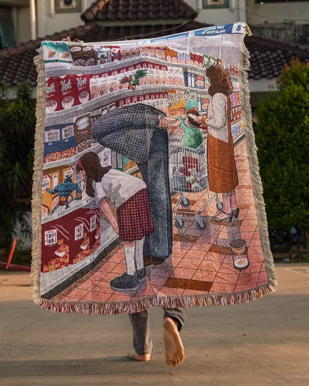 Karya dari Rezza Rainaldy ini merupakan karpet berukuran 130x180 cm yang dibuat dengan teknik tenun jacquard, menghadirkan motif yang menyatu langsung dalam serat kain. Dengan komposisi 70% poliester dan 30% katun, karpet ini lembut, tahan lama, dan memiliki warna yang kaya serta merekam kisah hangat dari momen keseharian.