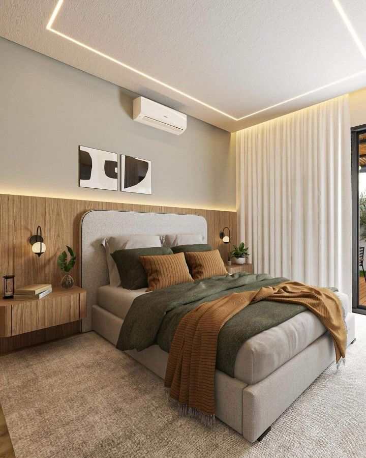 • Lampu LED tersembunyi di balik headboard atau bawah rak untuk aksen lembut.