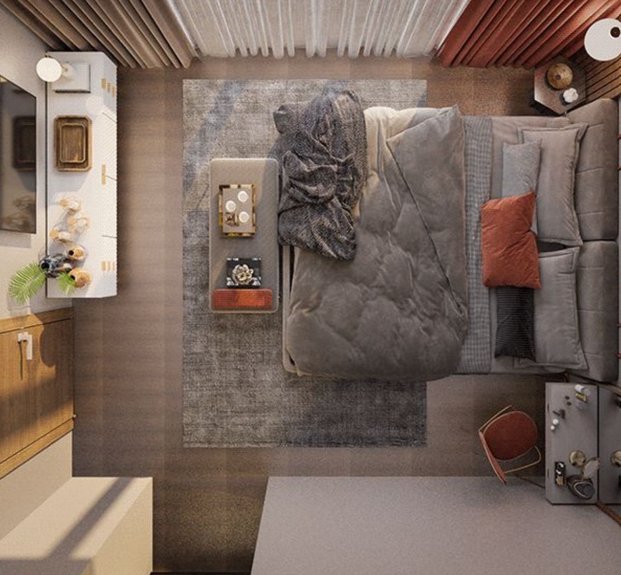 Meski kecil, kamar pasangan tetap harus memberikan rasa privat. Hindari penempatan cermin besar di depan kasur atau bukaan jendela yang langsung menghadap area luar.