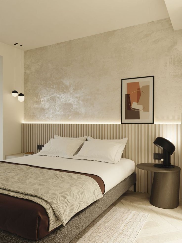 Gunakan warna netral yang hangat seperti krem, beige, atau abu muda, lalu tambahkan sentuhan lembut melalui tekstur kain dan pencahayaan hangat.