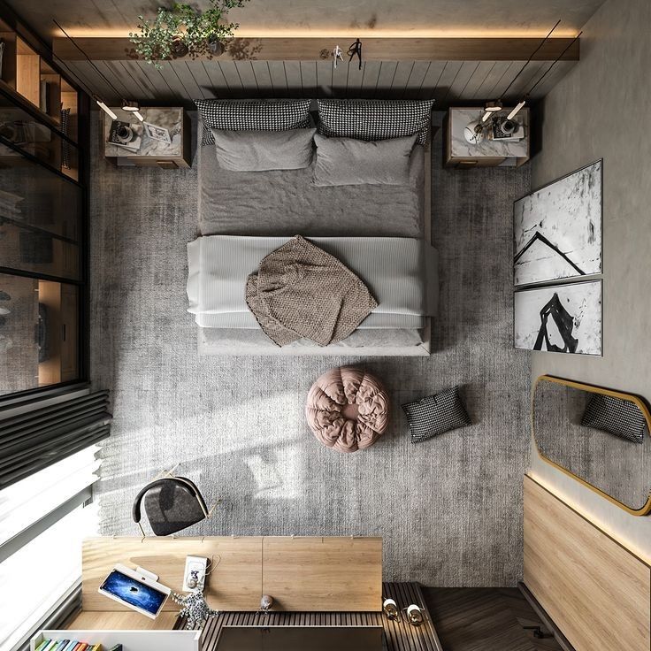 Letakkan kasur di tengah dinding utama agar seimbang, lalu tambahkan dua nakas kecil di sisi kanan dan kiri sebagai tempat lampu tidur atau penyimpanan ringan. Untuk menciptakan kesan lapang, gunakan headboard yang ramping atau tanpa headboard sama sekali.