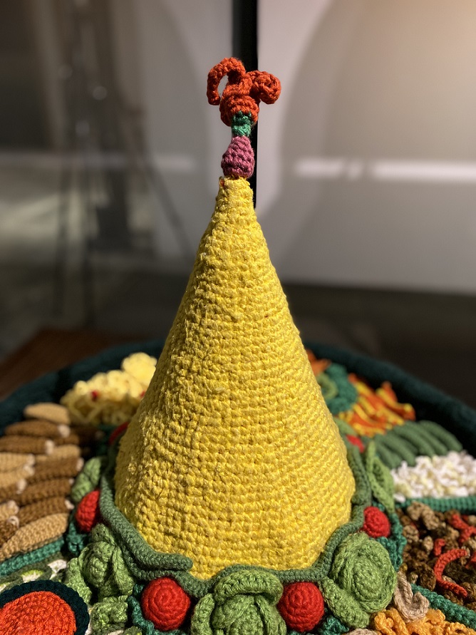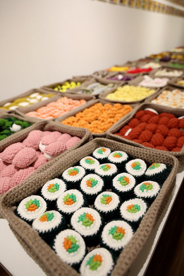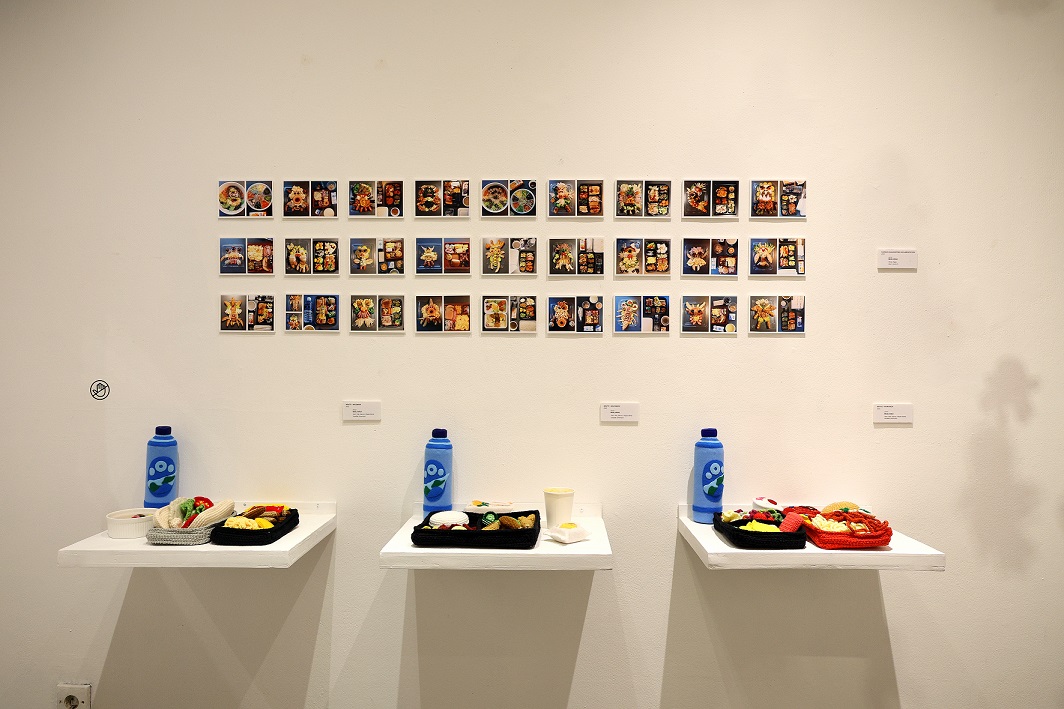 Pada dinding panel tertera potret lunch box yang menjadi inspirasi akan koleksi rajutan makanan sehingga ciptakan pengalaman rasa dengan visualisasi menarik.