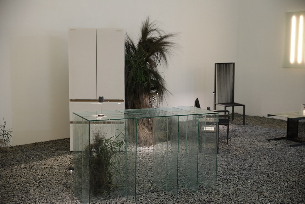 Di antara kursi-kursi serta bench dengan bentuk yang beragam, hadir pula side table dan standing table terbuat dari material kaca. Uniknya, permukaan kaca dari brand Himalaya Abadi ini miliki tekstur unik dengan garis-garis menyerupai guratan pada permukaan kayu yang didesain khusus oleh FFFAAARRR untuk instalasi ini. Di bawah cahaya dan saat dilihat lebih dekat, permukaan meja pancarkan warna biru kehijauan yang subtle sebagai aksen warna yang lembut di antara ruang bernuansa monokrom.