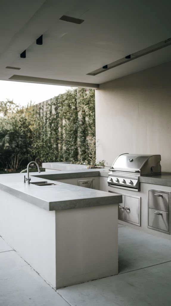Meski terbuka, dapur tetap perlu dilindungi dari hujan dan sinar matahari langsung. Gunakan atap kanopi transparan, pergola, atau kombinasi genteng kaca agar cahaya tetap masuk tanpa membuat area terlalu panas.