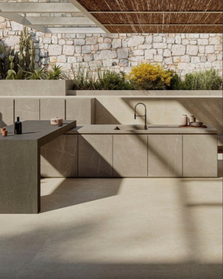 Tanaman hijau dalam pot, dinding taman vertikal, atau batu alam dapat memperkuat kesan natural dan membuat dapur terasa lebih menyatu dengan halaman.