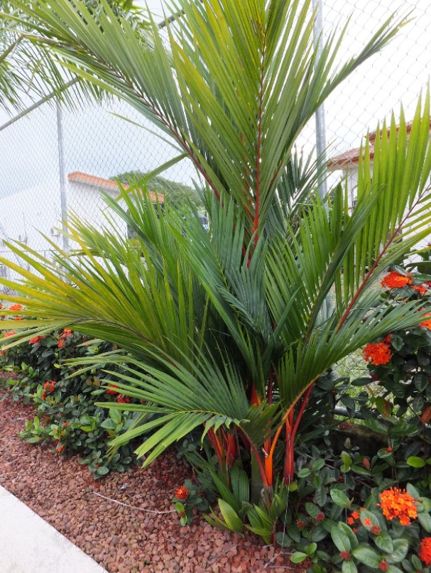 Saat dewasa, palem merah dapat mencapai tinggi 4–6 meter, namun tetap proporsional jika ditanam di pekarangan rumah.