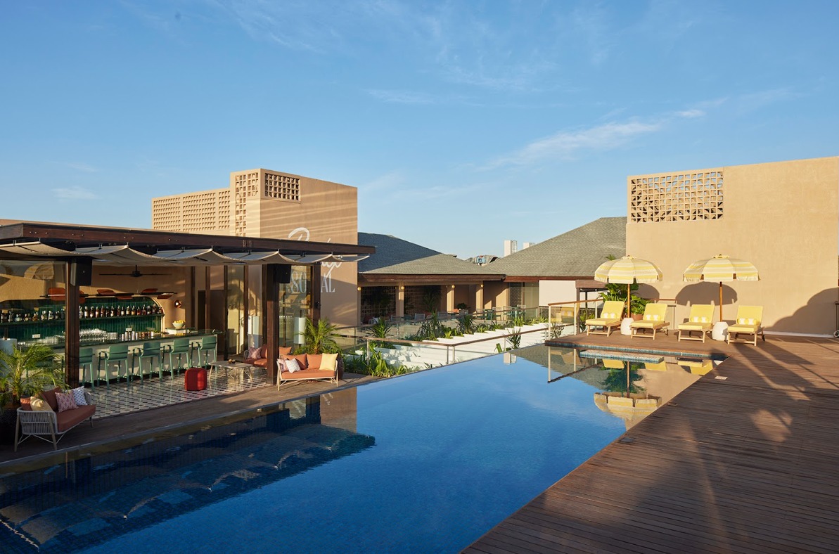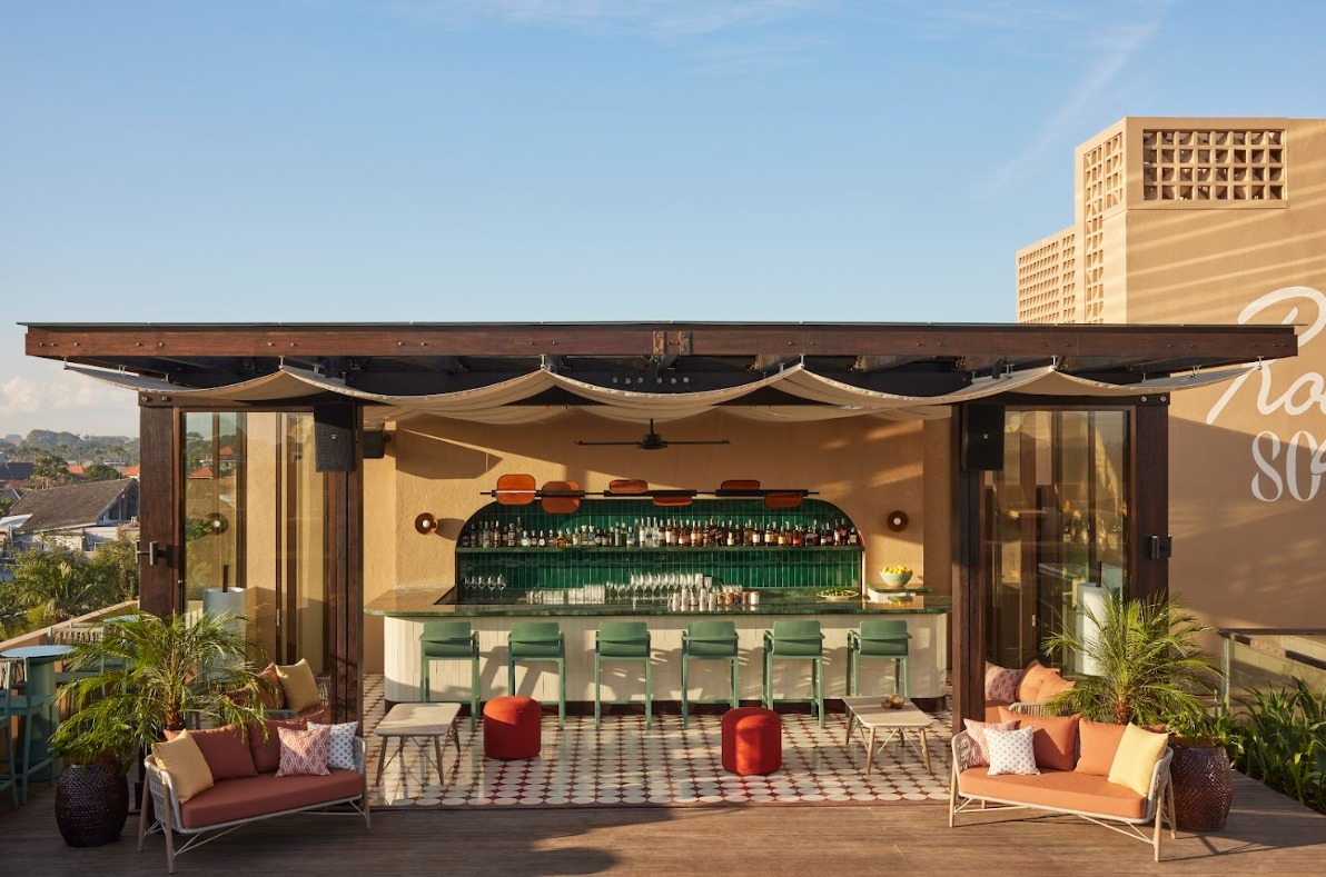 Rooftop Social hadir dengan gaya retro modern yang dihiasi furnitur artistik serta warna yang terinspirasi cahaya pesisir Bali. Area ini cocok untuk menikmati waktu berjemur, bersantai di tepi kolam, atau menikmati aperitif saat matahari terbenam.