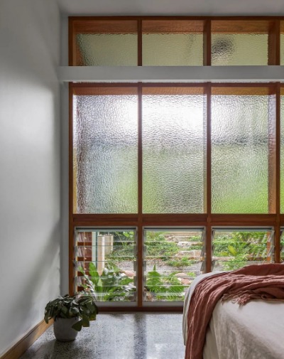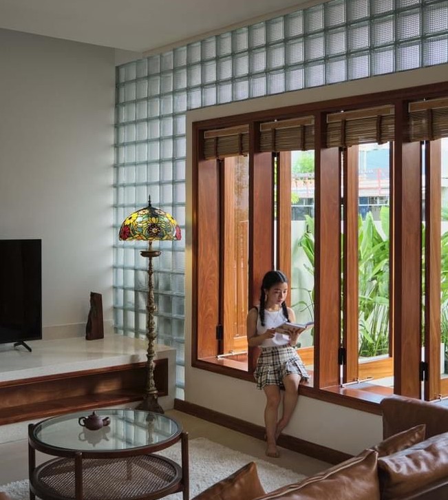 • Jendela kombinasi kaca lebar dan kaca nako untuk nuansa mid-century