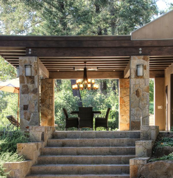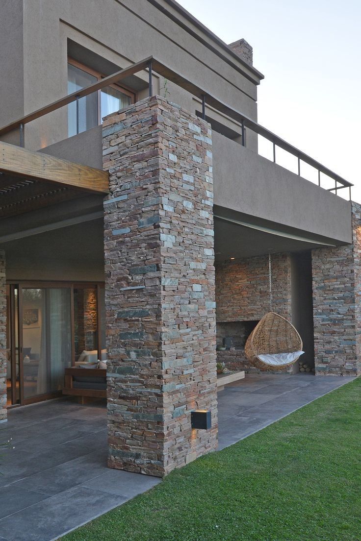 2. Tiang kotak kombinasi batu bertekstur dan atap woodplank untuk tampilan modern tropis.