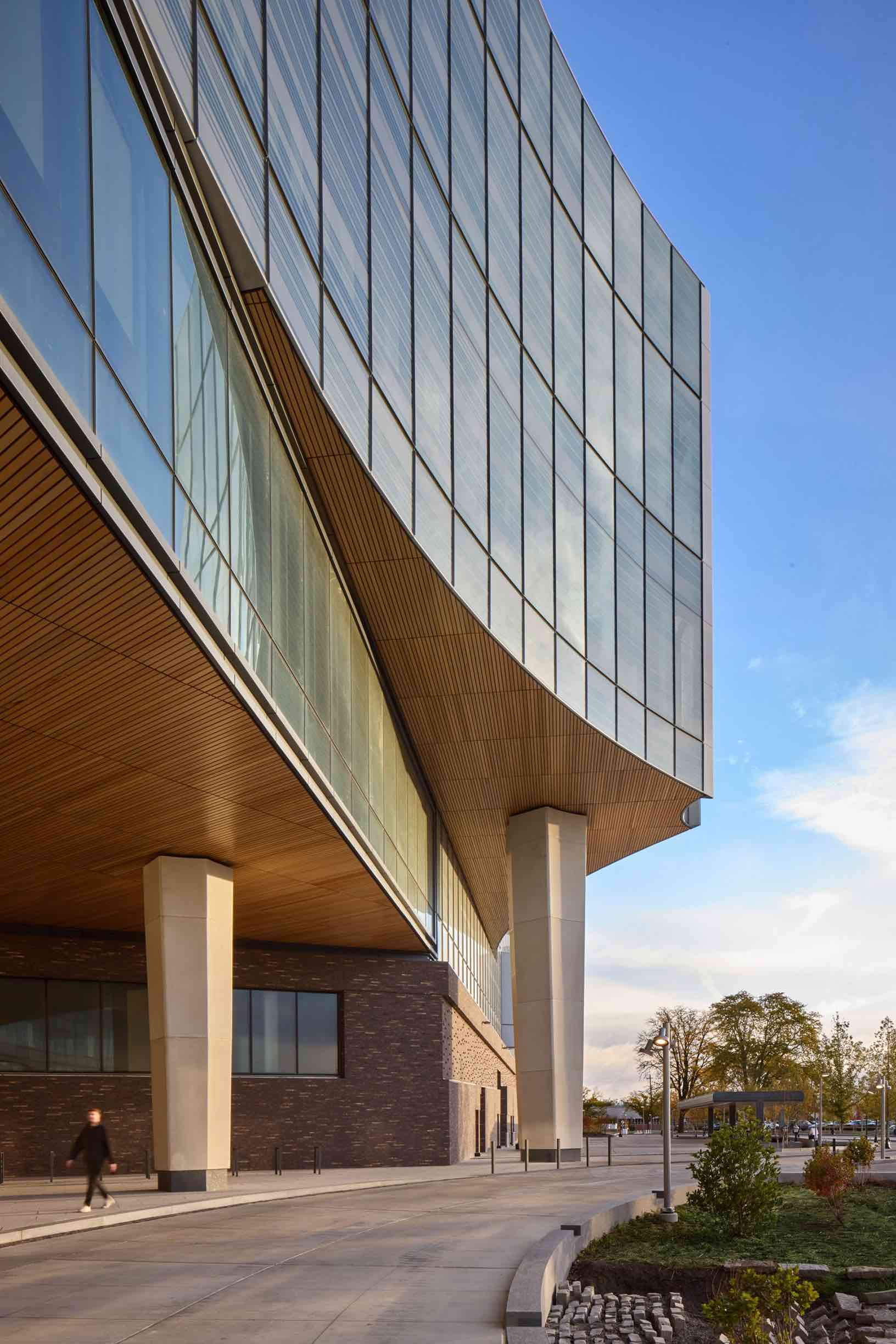 Bangunan mencakup empat lantai dengan struktur kaca reflektif dan atap soffit kayu cedar yang hangat di bagian ujung fasad. Garis fasad kaca memiliki pola scalloped yang unik: bagian kaca melengkung keluar, menjuntai pada pilotis ramping, menciptakan kesan ringan dan dinamis.