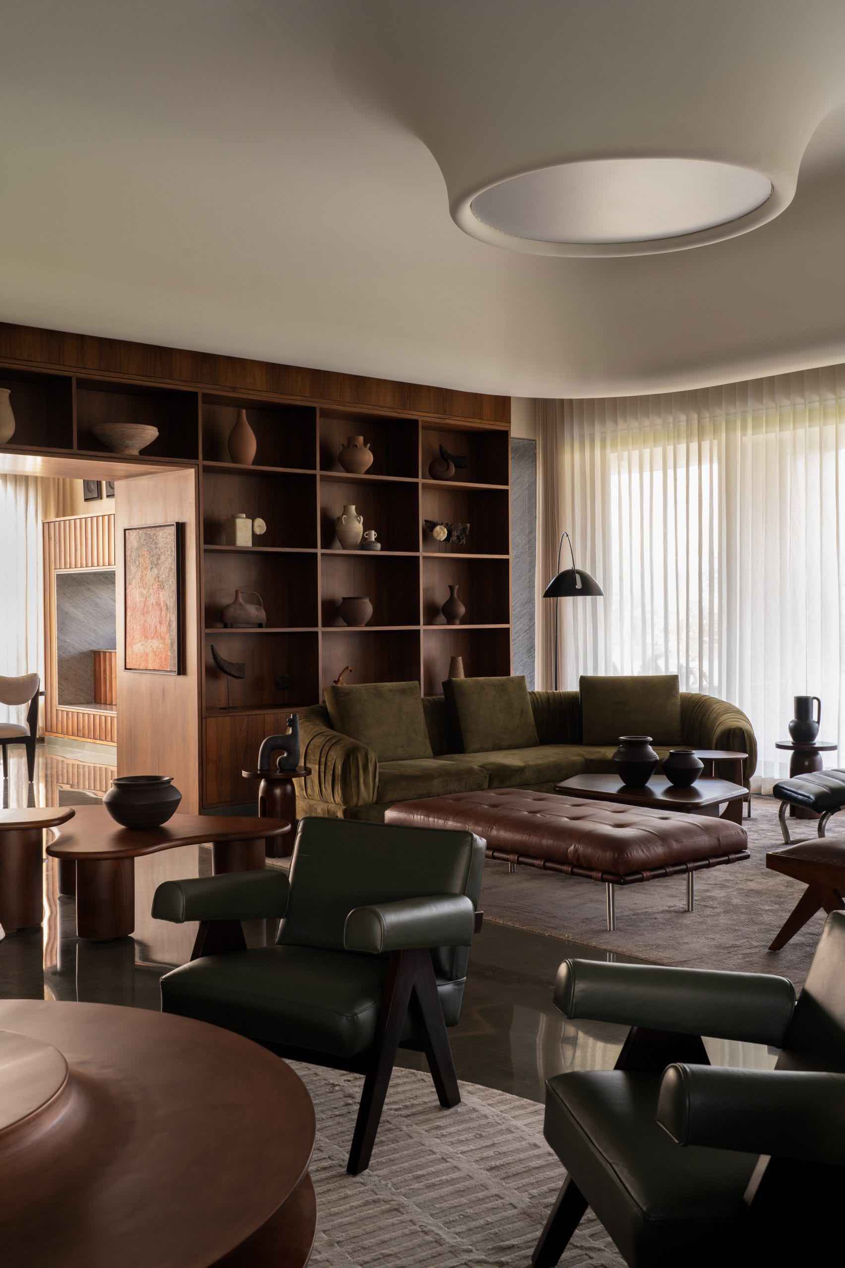 Arsitektur ini dirancang dengan sangat hati-hati agar setiap sudut memungkinkan pengalaman visual yang berbeda, dinding bata menciptakan tekstur kasar, sedangkan interior menghadirkan bahan kayu halus, sofa kulit rendah, dan furnitur bergaya mid-century modern yang sederhana namun elegan. Keseimbangan antara kekasaran dan kelembutan ini memperkuat karakter rumah sebagai ruang meditasi, bukan sekadar tempat tinggal konvensional.