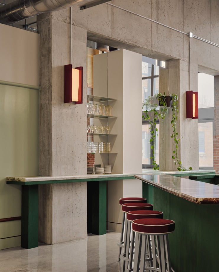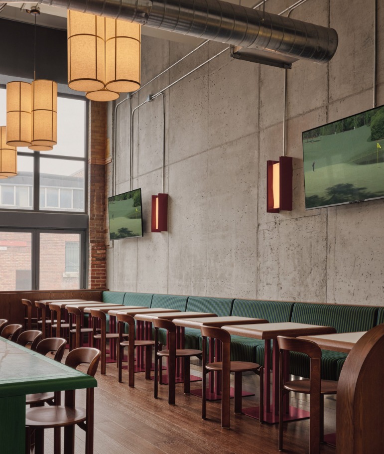 Klub golf indoor ini berdiri dalam sebuah bangunan industri bersejarah di Montréal yang telah berdiri sejak awal abad ke 20. Karakter asli bangunan sengaja dipertahankan. Dinding bata ekspos, pilar baja, dan lantai beton dibiarkan tampil jujur sehingga menghadirkan nuansa autentik yang kuat. Alih alih menghapus masa lalu, desainer justru memanfaatkannya sebagai fondasi atmosfer baru yang lebih elegan.