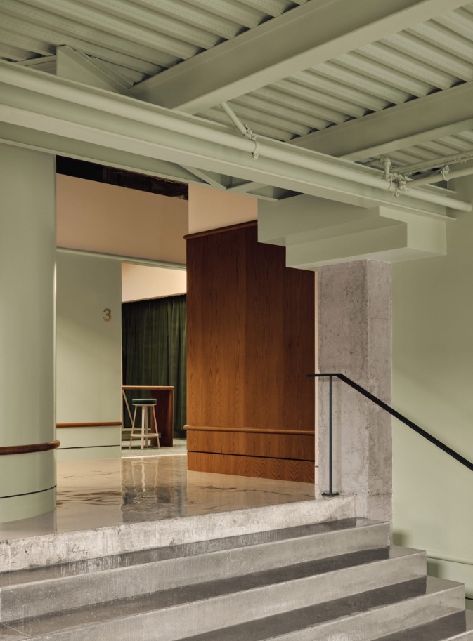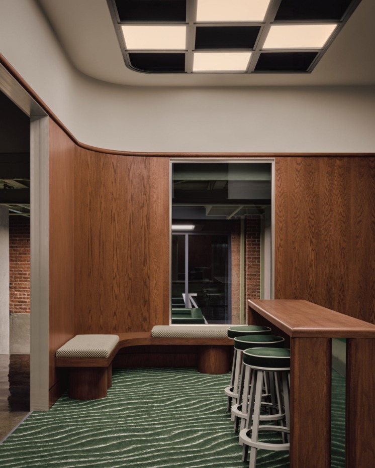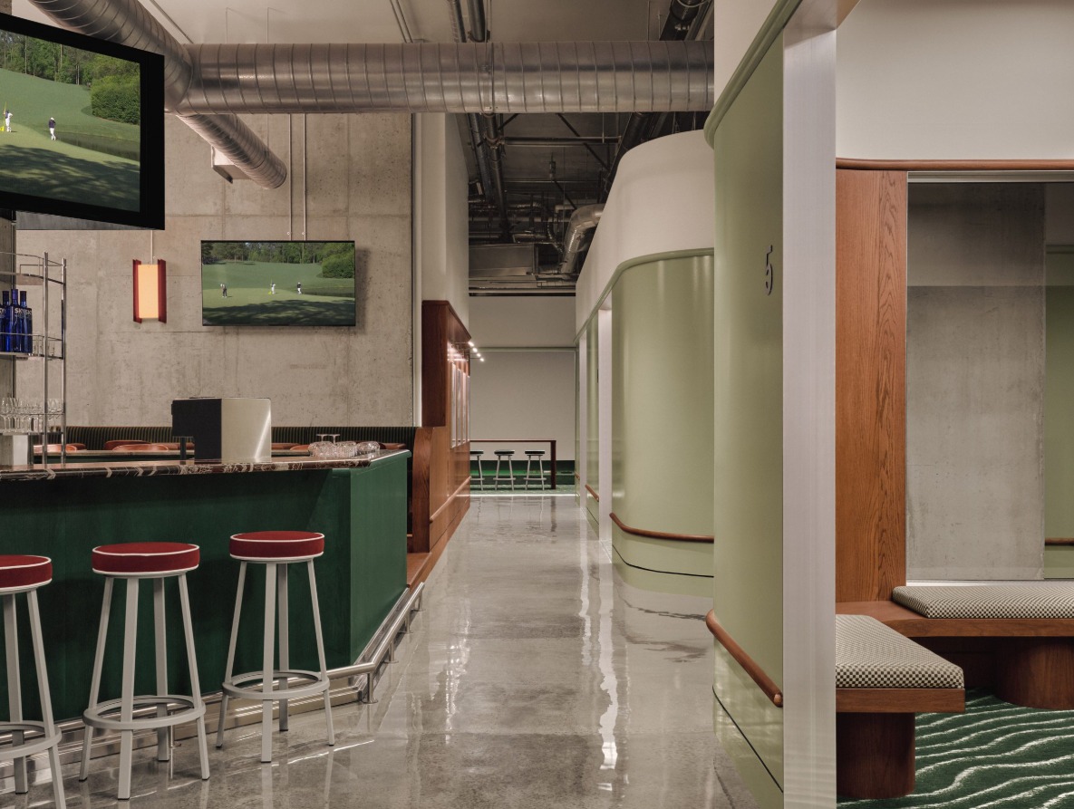 Alih alih tampil seperti fasilitas latihan modern yang dingin, klub golf ini menonjolkan kesan ramah dan intim. Bayangkan ruang industri tua yang dipertahankan karakter aslinya, lalu dipadukan dengan material hangat, warna pekat, pencahayaan lembut, dan sentuhan kemewahan yang subtil. Semua elemen ini menciptakan perpaduan harmonis antara karakter bangunan lama dan visi desain kontemporer yang lebih humanis.