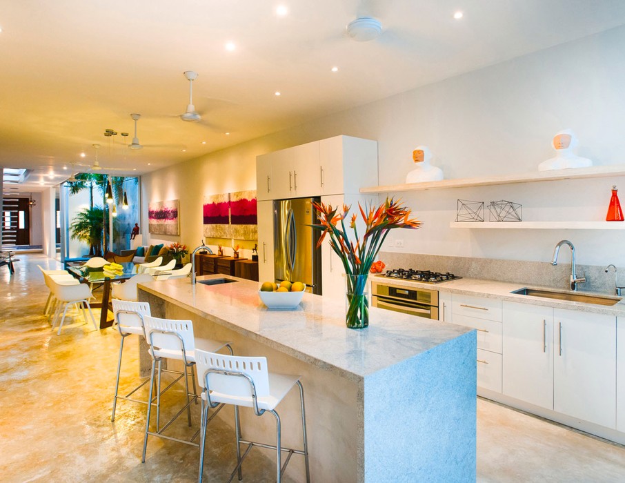 Keramik tegel dengan motif beragam disusun dengan rapi pada dinding bisa menjadi focal point yang unik, menarik, dan bernilai artistik. Kehadiran banyak bukaan besar dan dominasi warna putih pada dinding dan ceiling, semakin membuat rumah terasa lebih lapang, terang, dan homey.