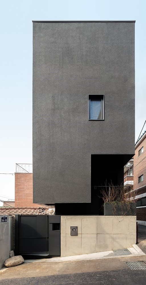 Bentuk geometris sederhana pada eksterior rumah ini dan penggunaan dominasi warna hitam, membuat rumah ini terlihat lebih modern dan elegan. Jendela kecil yang ditempatkan strategis tidak hanya bisa menjaga privasi di dalam rumah, tetapi juga menyeimbangkan sekaligus menambah karakter pada tampilan eksterior rumah.